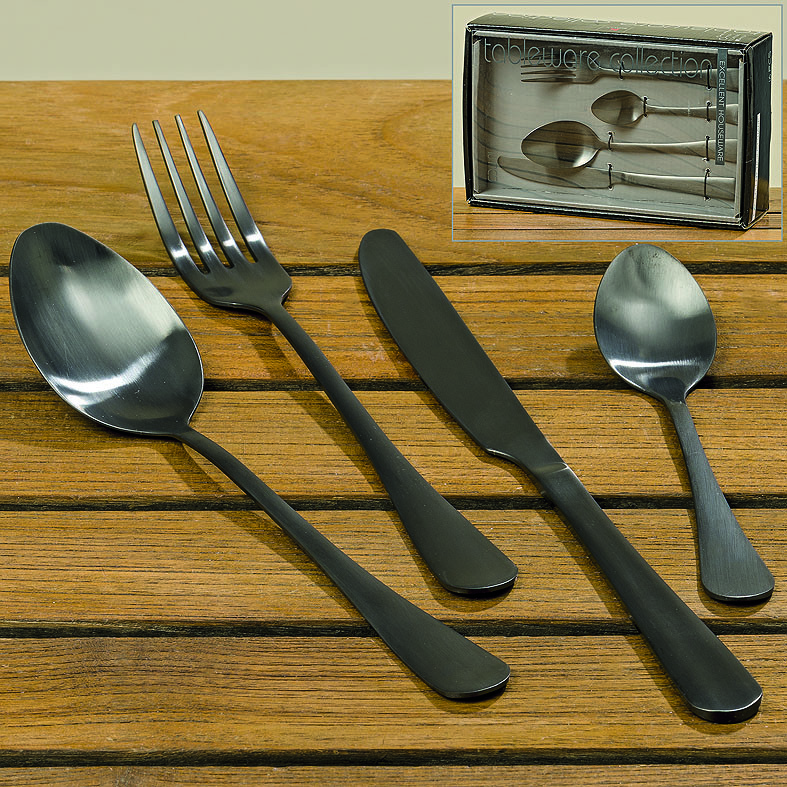 Набір столових приборів розрахований на 4 персони і складається з 4 столових, 4 чайних ложок, 4 виделок і 4 столових ножів. Прибори виготовлені з нержавіючої сталі. Не рекомендується мити в посудомийній машині.